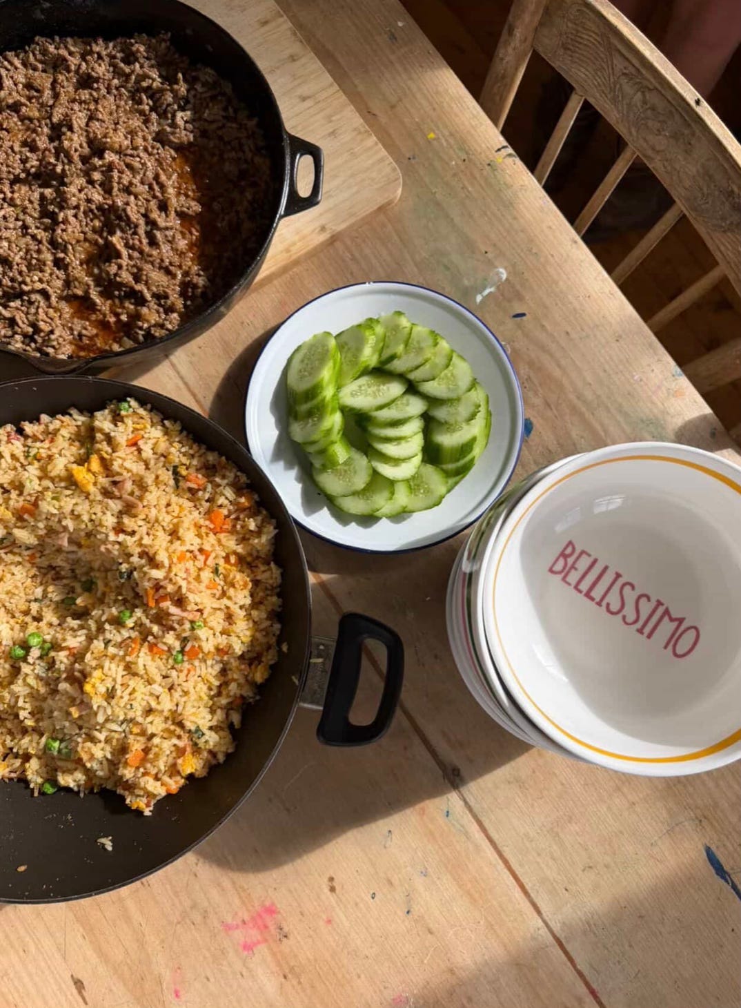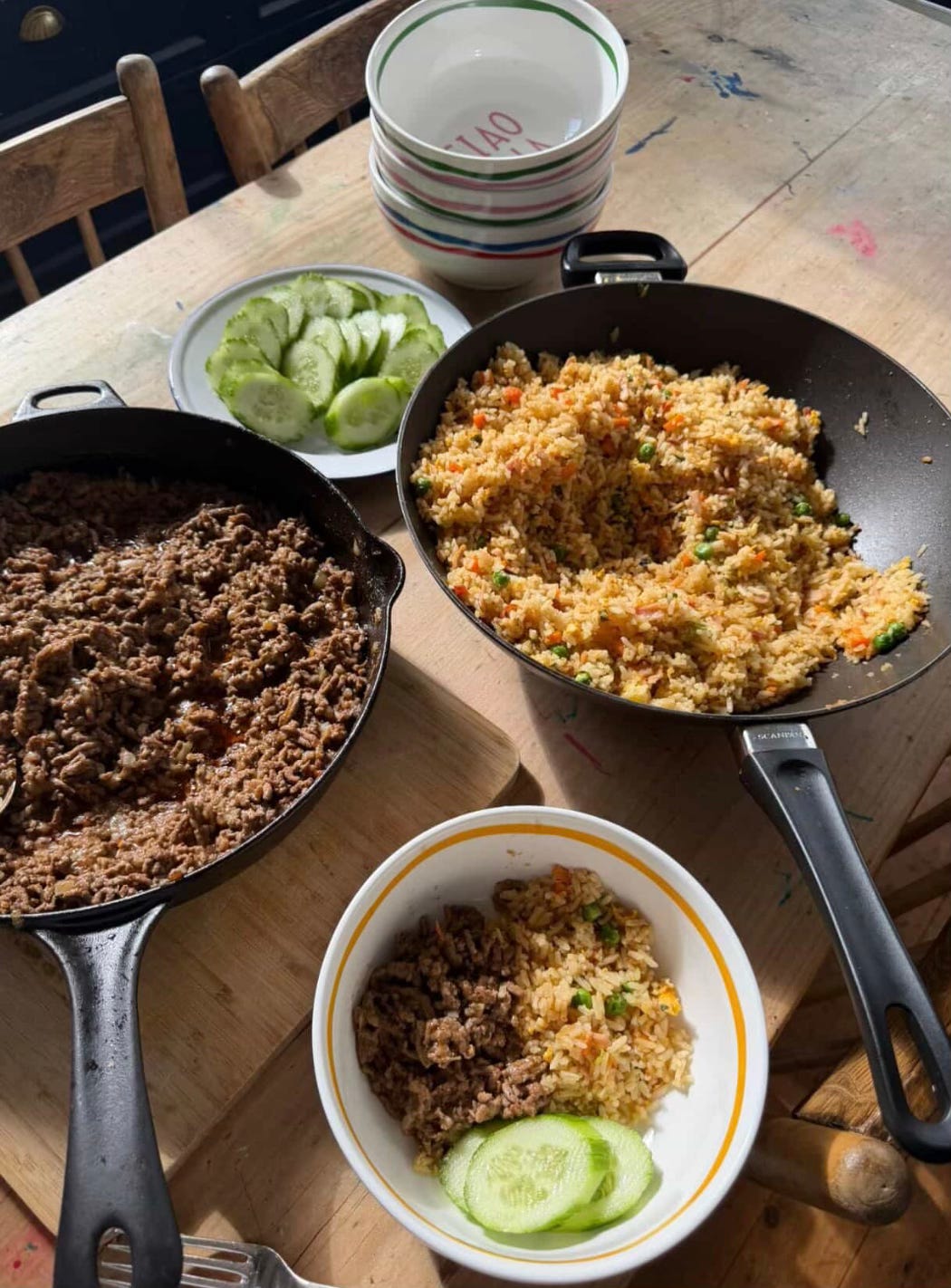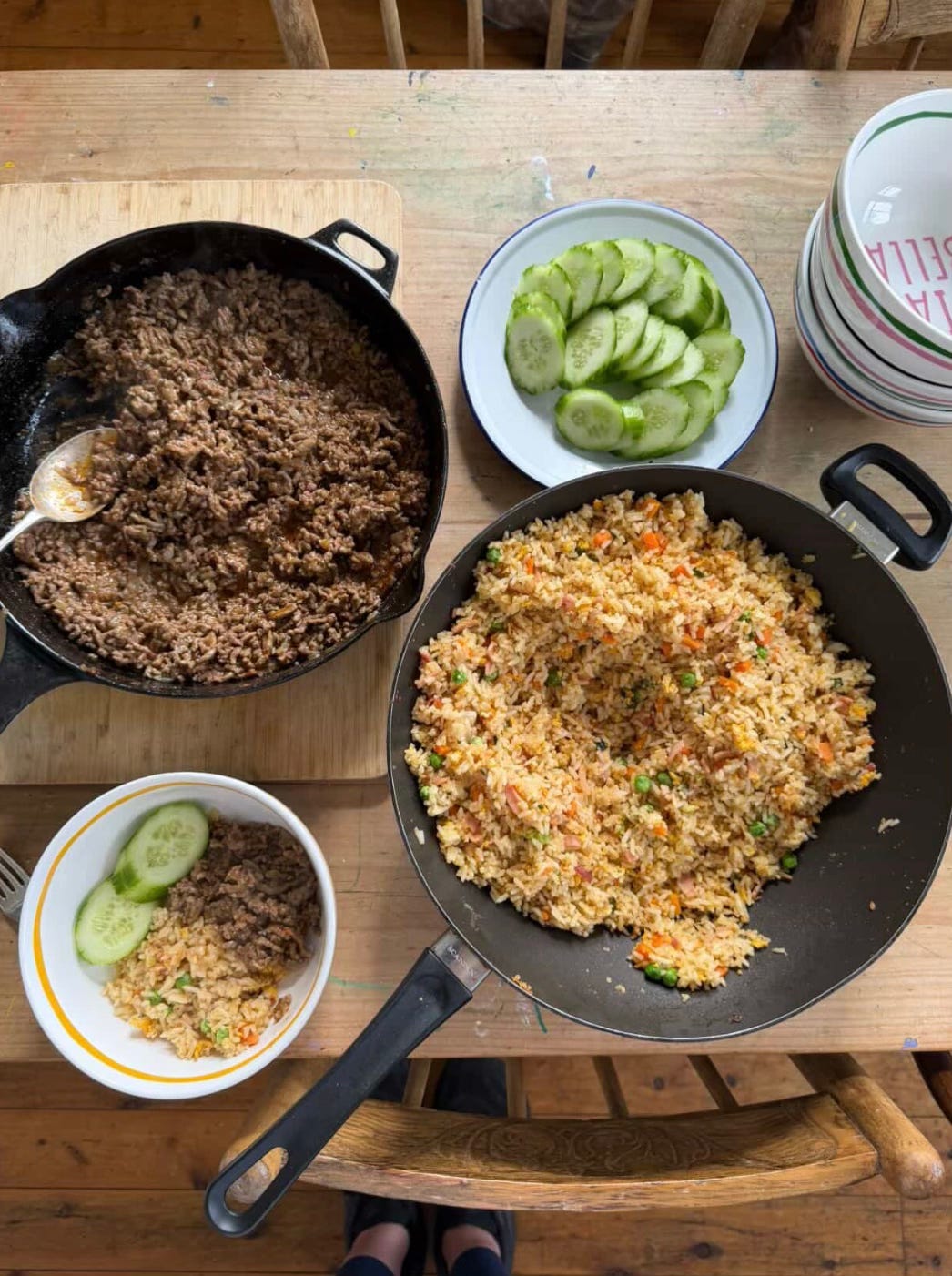 Fried rice, Lebanese cucumber slices, runny fried eggs, chilli sauce and fresh coriander (if you’re lucky enough to have it) - to serve