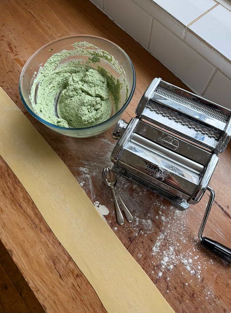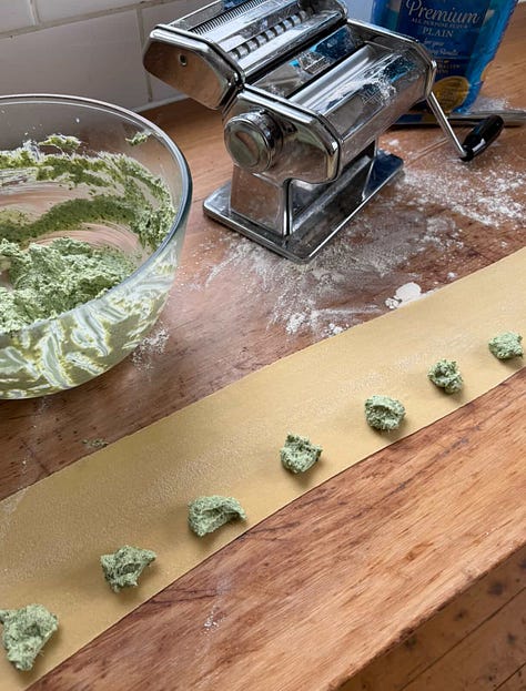 Using a pasta rolling machine, divide the dough into three and working with one portion at a time - roll out until you’ve got a lovely long strip of dough. (I start on the ‘O’ setting - putting the dough through twice, before setting the machine to ‘1’ - rolling out twice and then continuing working my way through - ‘2’, ‘3’, ‘4’, etc until number 7. I find that this is then beautifully thin and perfect for making ravioli.