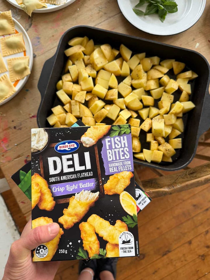Then all you need to do is whack the spuds (which are just some cubes of potato tossed in olive oil with salt and pepper) and fish for the kiddies in the oven and pan fry the barramundi for the adults. Easy peasy.